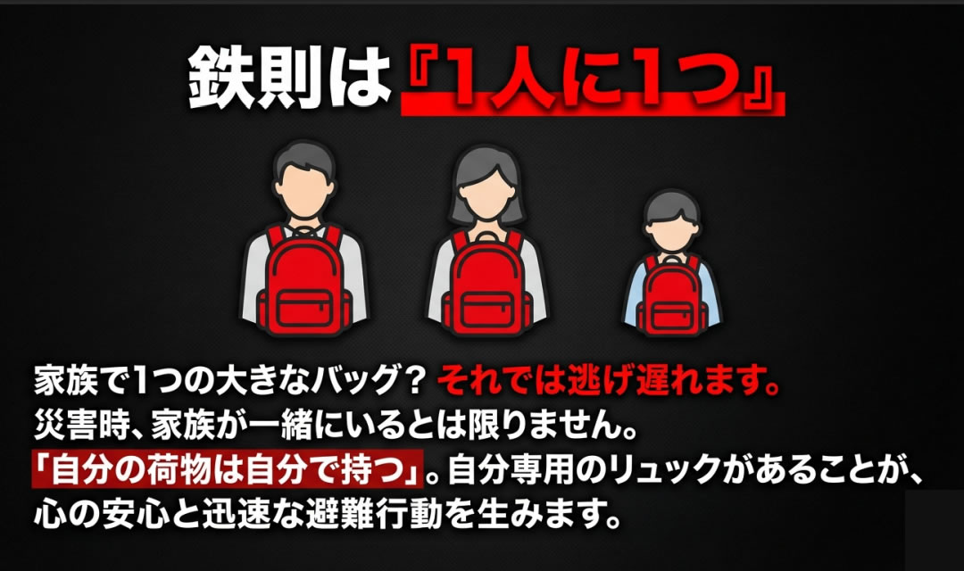 このリュックは、避難所に 「一緒に持って行く」ために 設計されています。